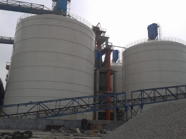 本大型钢板库在库底中心建有一锥形封闭减压锥,在减压锥底部配置物料活化气力装置(带料可抽出流化棒),侧板配置物料发送器,顶部配置垂直卸料管。库底环形卸料区与水平面有17°的斜度,分20-40个充气区。卸料充气区分外环充气区和内环充气区(空气压力0.4MPa),并在外区两相邻导料槽间设置导料锥,构成V型卸料单元。当轮流向某一充气区送入压缩空气时,该区物料呈流态化,并通过导料管流入中心区减压锥中,同时使库内的物料呈旋涡状塌陷,在物料的下移过程中产生重力混合均化。进入减压锥的物料经充气搅拌成为活化物料,具有较好的流动性,经发送器的集料、射流作用,进入输送涌管内,完成钢板库的出料。